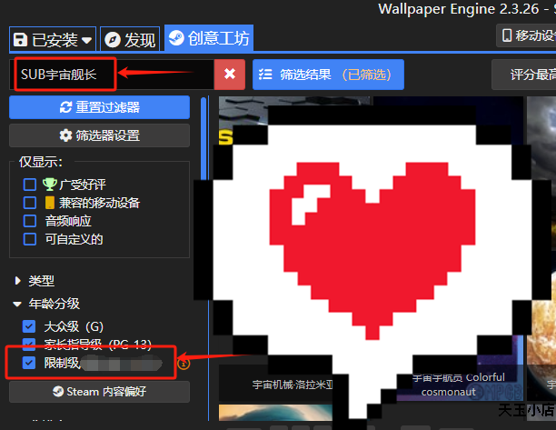 游戏视频可以wallpaper搜索:SUB宇宙舰长(需开启红框内选项)